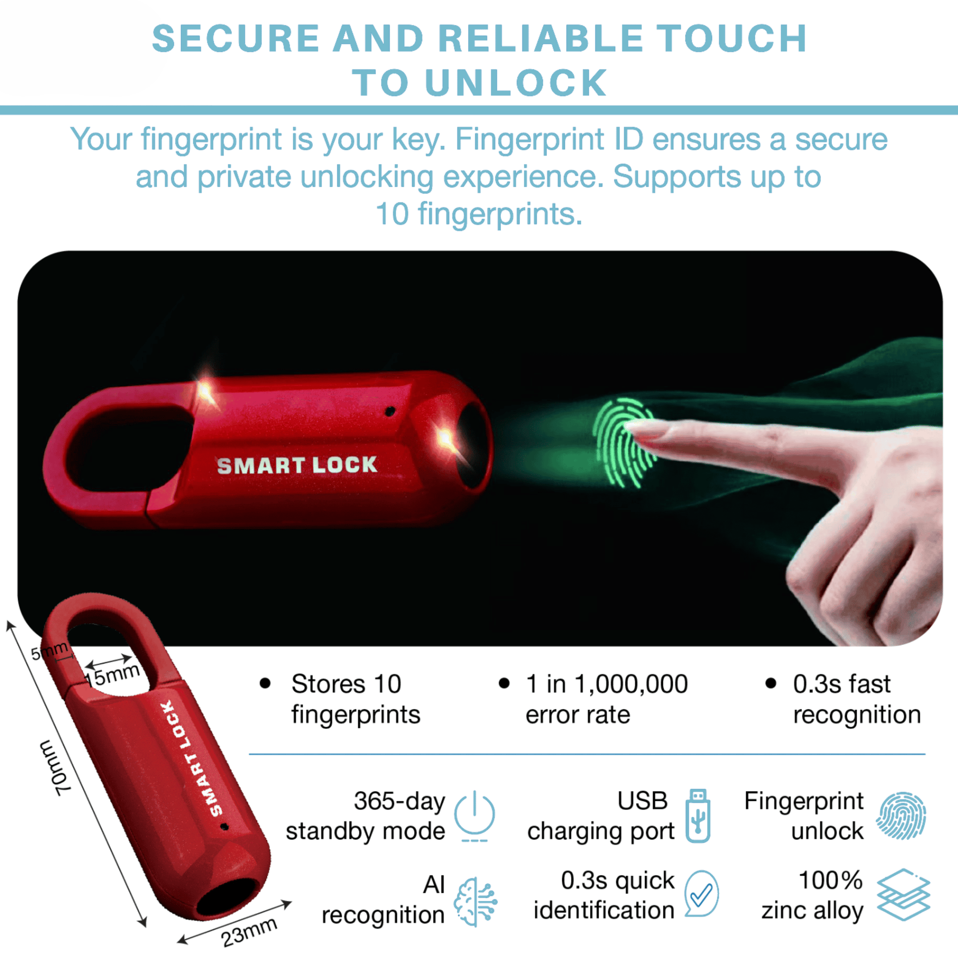 Once fully charged via micro-USB, the built-in 110mAh battery offers up to 1,000 unlocks and 1-year standby time. It also includes a low battery alert so you’re never caught off guard.