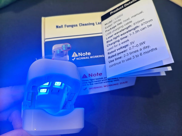It uses dual light technology — 470nm blue light and 910nm infrared — to penetrate the nail plate and thermally destroy fungal cells, preventing future growth.